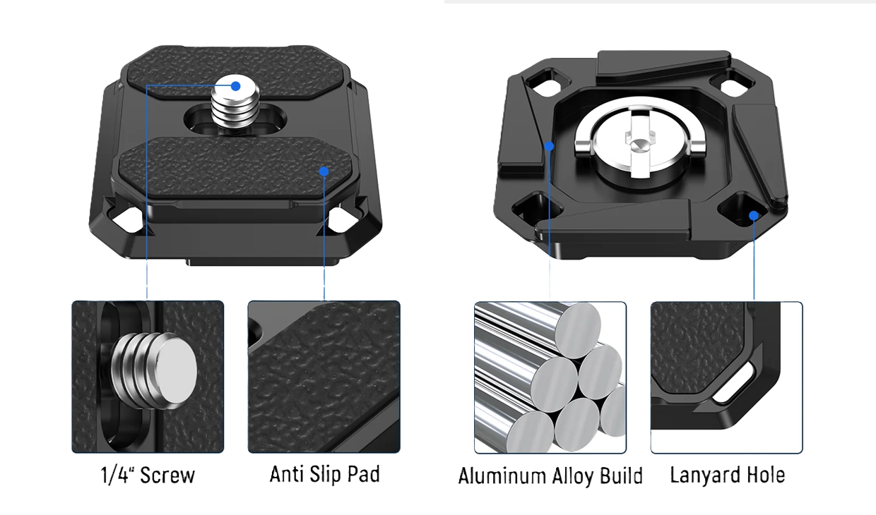 The basic version QPR-5 (for ease of referencing the QPR-5A, or ‘A‘) is very similar in shape and functionality with comparable competitor designs, offering 4 lanyard loop attachment holes at the 4 corners, anti-slip pads on the top interface (split in two for the A), slot in the middle for the 1/4 screw.